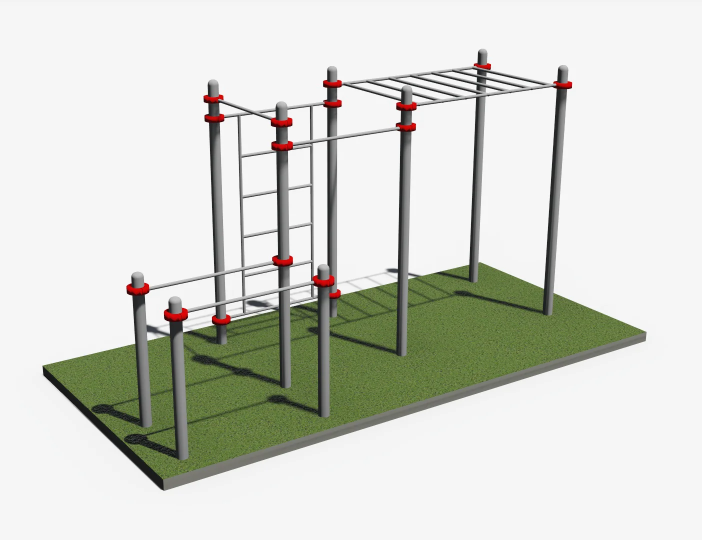 К опорным столбам высотой 2600мм крепятся с помощью хомутов: перекладина турника длинной 1200 мм и рукоход шириной 1200мм на высоте 2550 мм. Шаг рукохода 31 см. Шведская стенка шириной 1200 мм и перекладина турника шириной 1200 мм фиксируется на высоте 2350 мм. Перекладины брусьев длинной 1700 мм фиксируются к опорным столбам высотой 1500 мм и 2600 мм на высоте 1400 мм. Общая длина комплекса составляет не более 5400 мм.