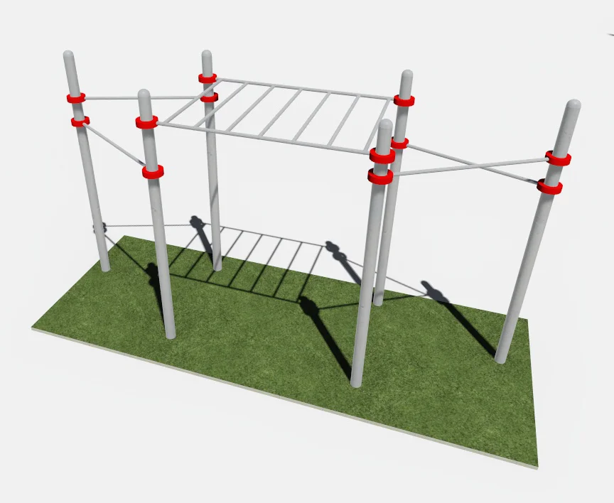Опорные столбы высотой 2600 мм в количестве 6 единиц, к которым крепится на высоте от уровня основания 2450 мм рукоход, на высоте 2300 мм, 2100 мм, 1900 мм -перекладины турника-треугольника.